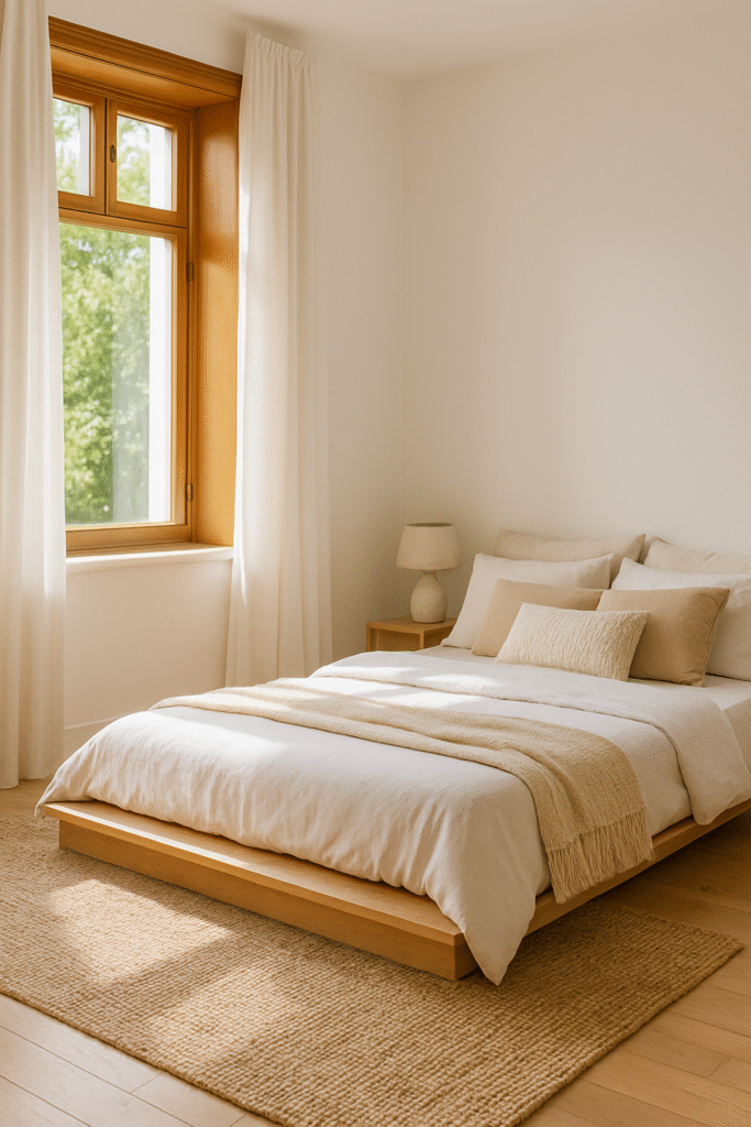 Platform bed with neutral bedding, low to the floor with cozy layers and a woven rug.