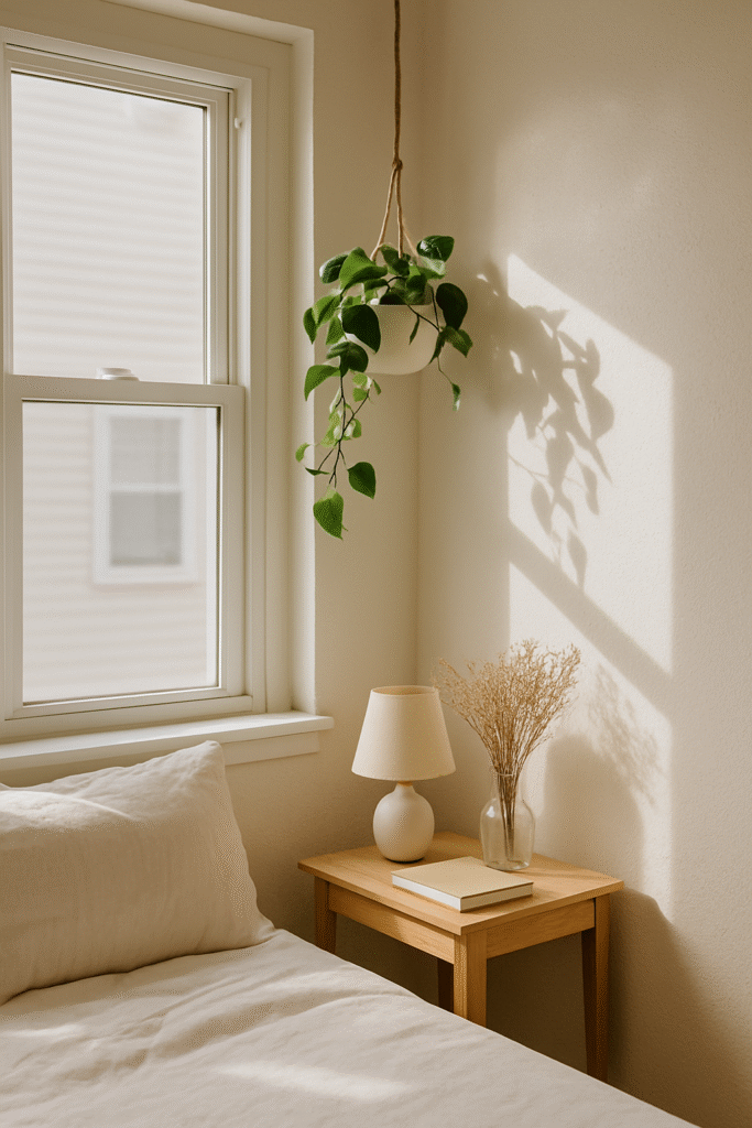 A small plant in the corner or on a shelf adds life, color, and oxygen. Choose low-maintenance options like pothos, snake plant, or a peace lily.