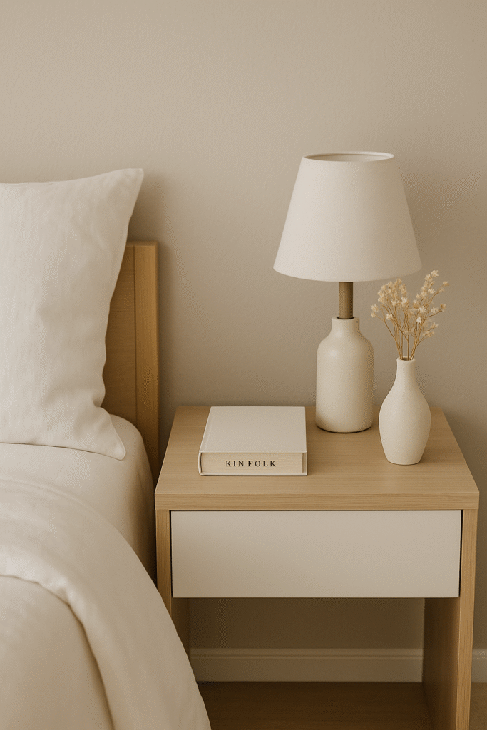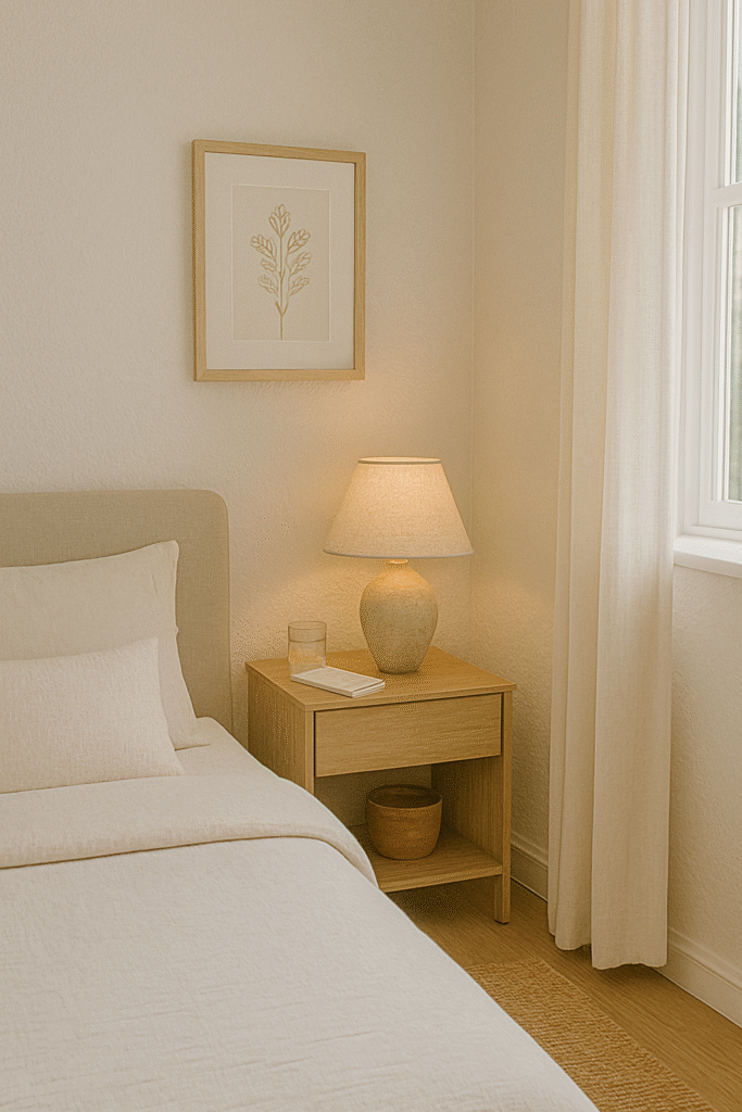 Opt for light oak, birch, or whitewashed finishes to keep the room feeling soft and airy. Dark furniture can feel heavy and shrink the room.