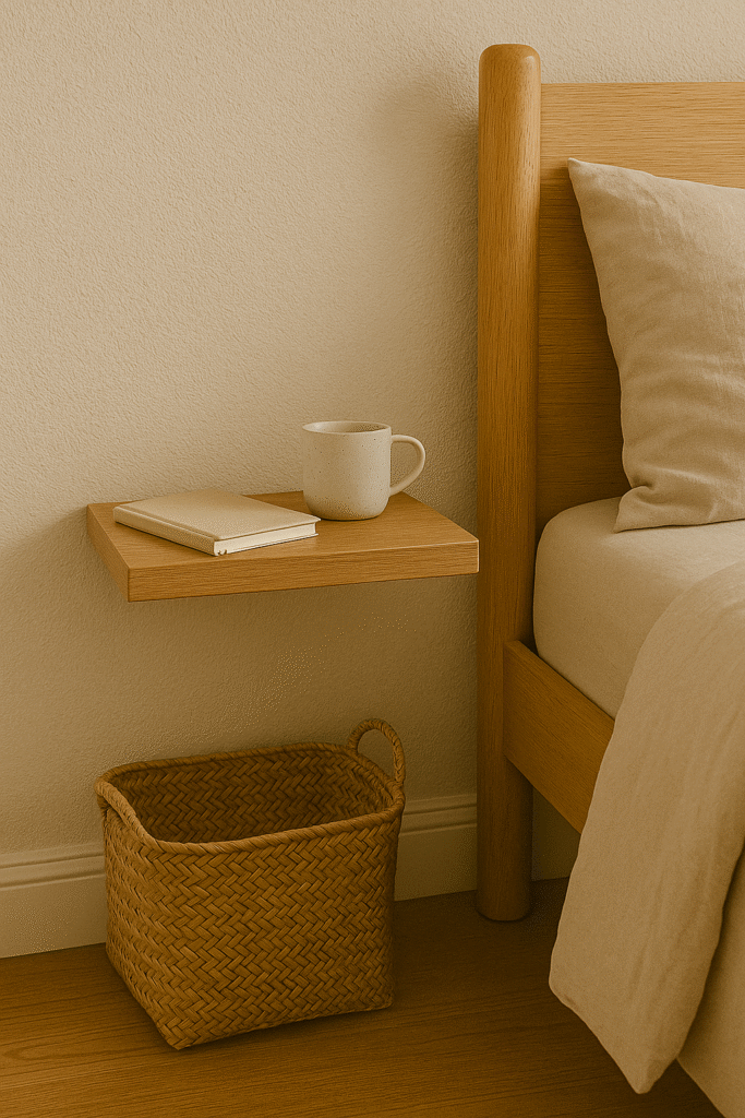 Mockup image: Floating wood nightstand with a journal and mug beside a bed.