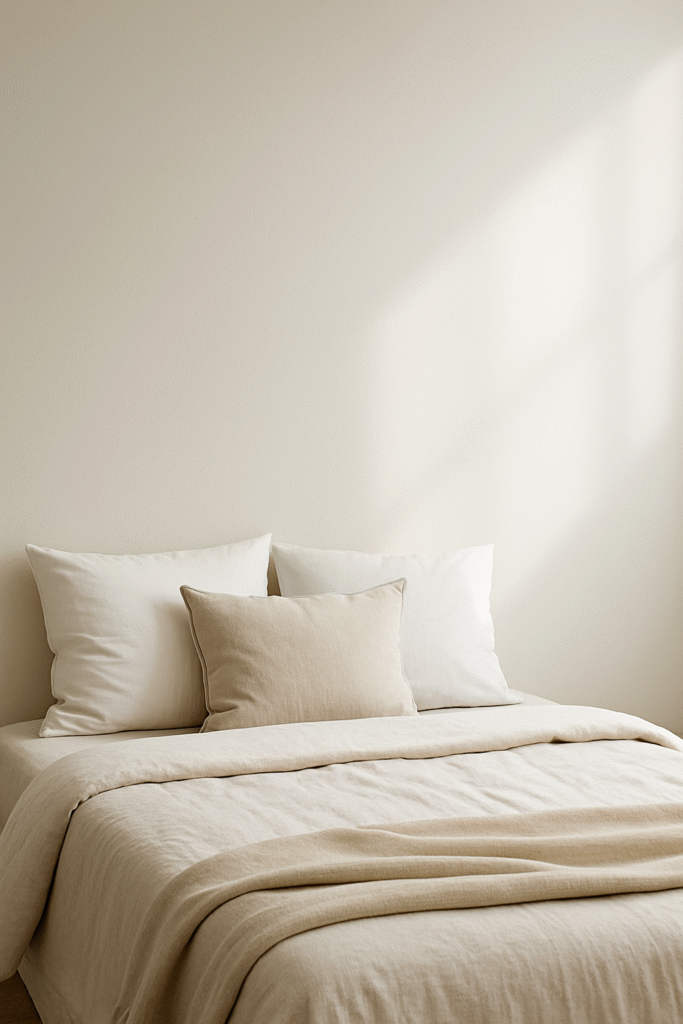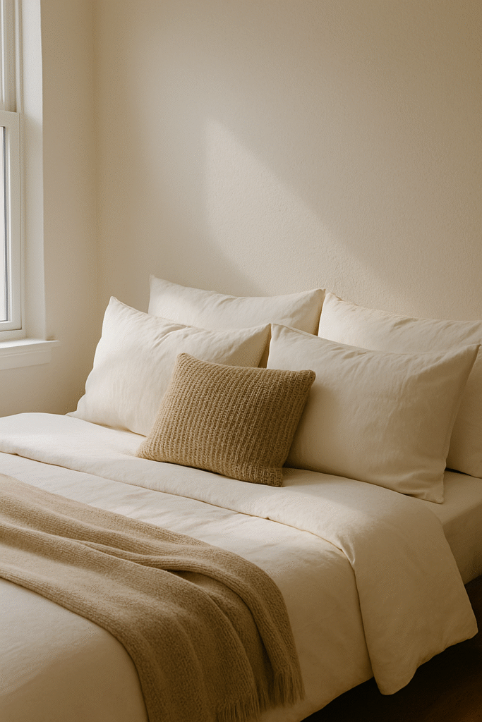 Light-filled bed with layered pillows, linen duvet, and a single cozy throw.