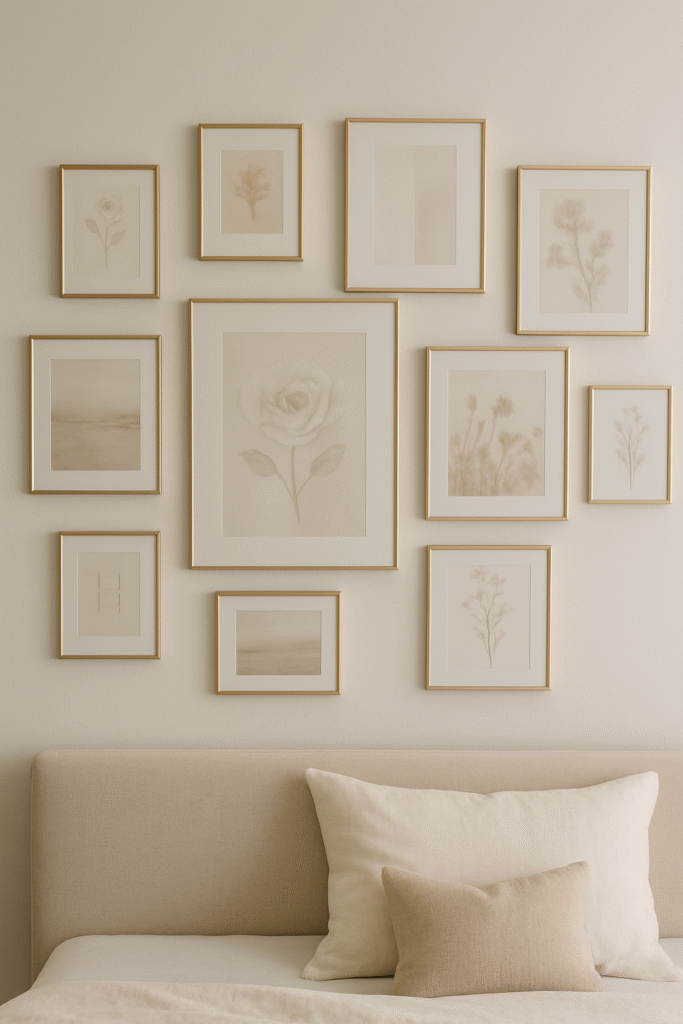 Mockup image: Light gallery wall with soft-toned art and delicate gold frames.