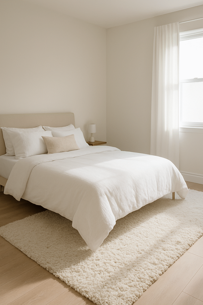 Mockup image: Minimal bedroom with nothing on the floor except a cozy area rug.
