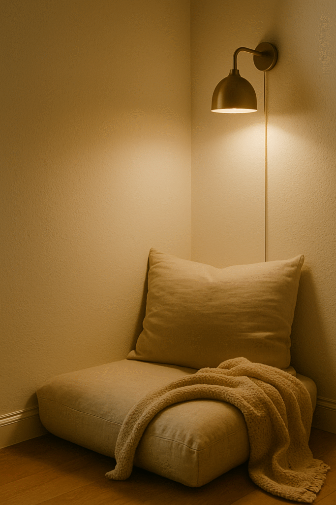 Minimal corner nook with soft floor cushion, a blanket, and a warm reading light.