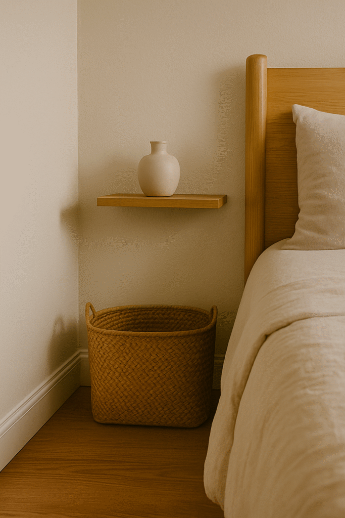 Mockup image: Neutral-toned basket tucked under a floating shelf next to the bed.