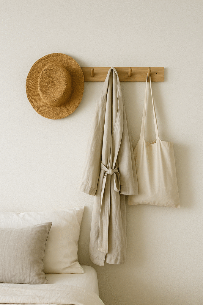 Mockup image: Wood peg rail with linen robe, straw hat, and a hanging canvas bag.