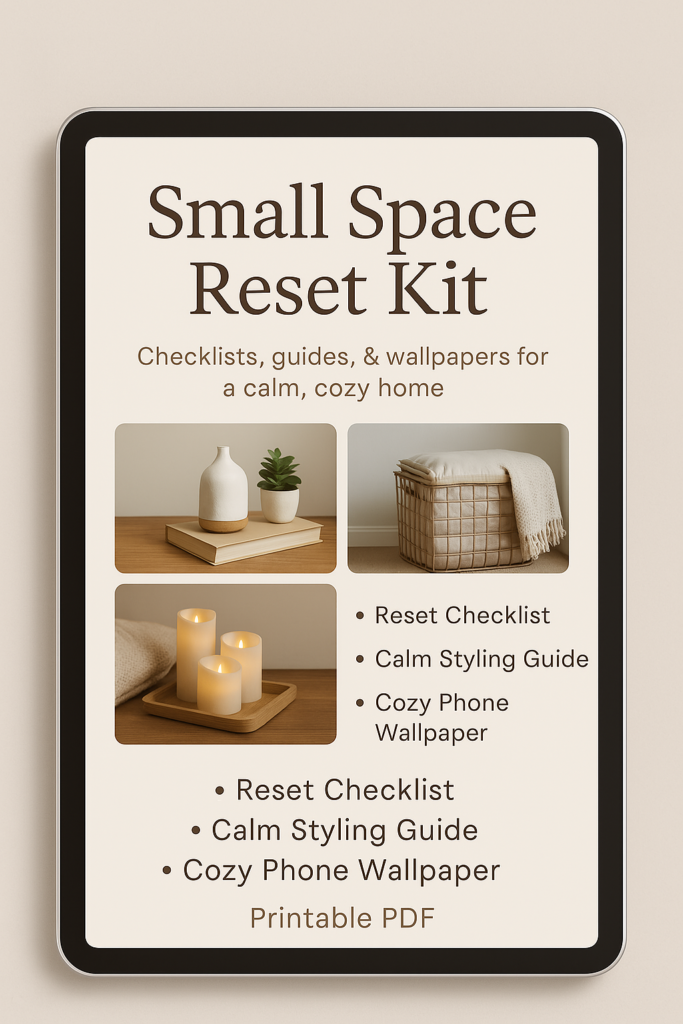 Grab The Small Space Reset routine Kit — includes checklists, cozy guides, and calming wallpapers to walk you through each step.